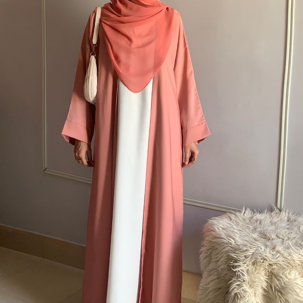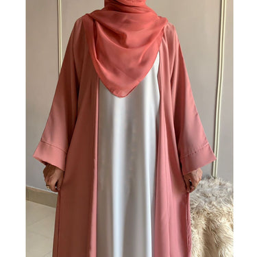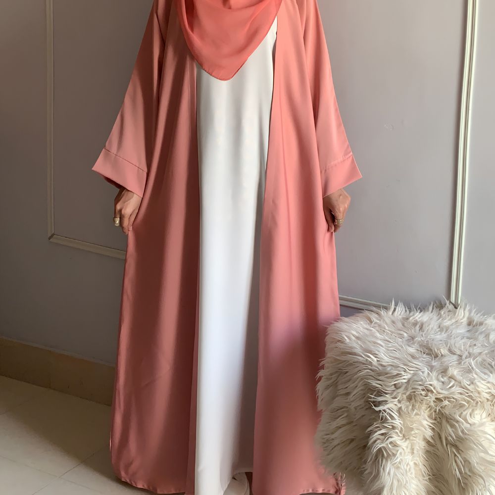 Effortlessly graceful, this soft blush abaya is the perfect blend of comfort and refined femininity. Crafted from lightweight Nidha fabric, it drapes beautifully with a flowy silhouette that flatters every movement. The self-tie belt cinches at the waist, allowing you to style it loose for a relaxed look or fitted for a more defined shape.