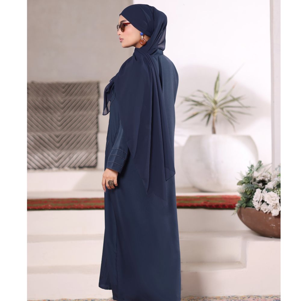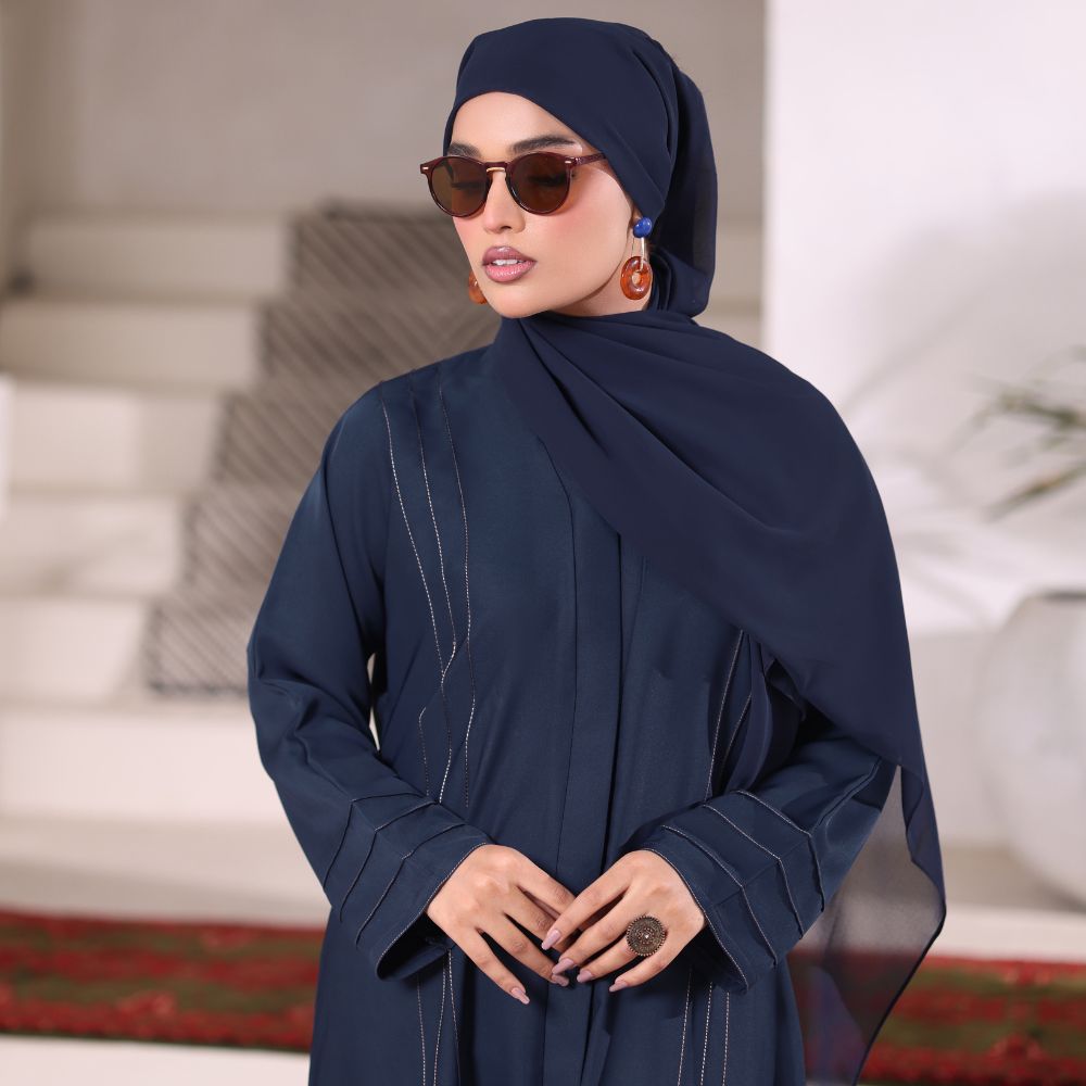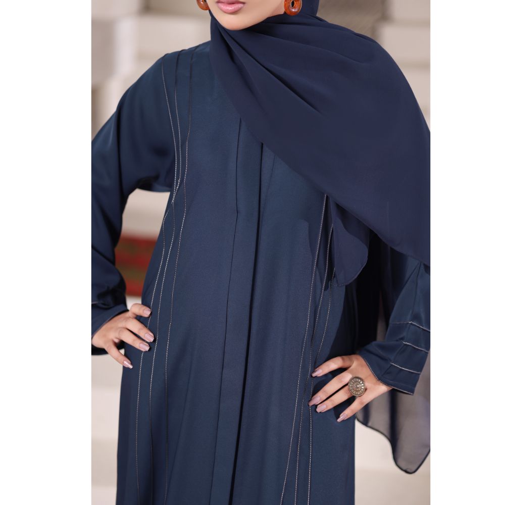 Experience effortless elegance with this navy blue abaya, tailored from premium Nidha fabric known for its soft texture, lightweight feel, and graceful fall. The abaya features delicate vertical stitch detailing on the front and sleeves, adding a refined touch while maintaining a modest, timeless look.