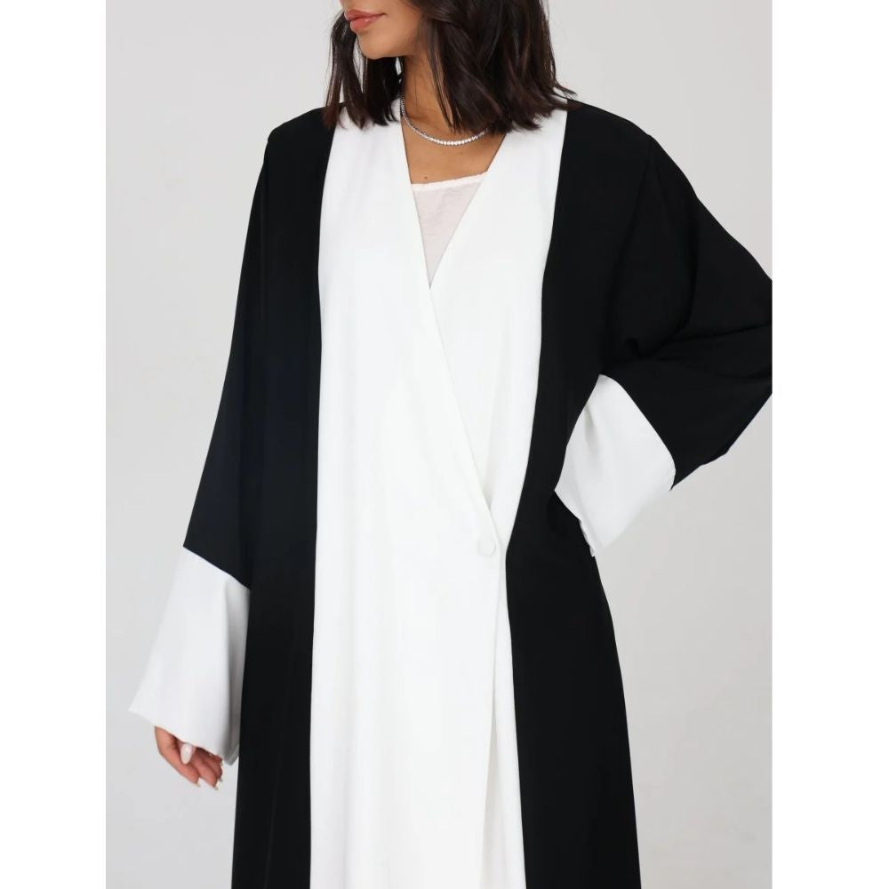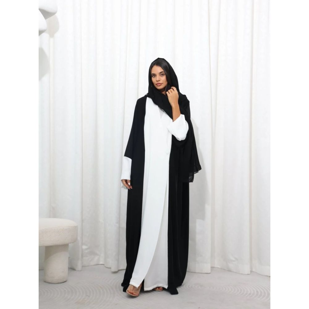 The contrasting tones create a contemporary yet modest appeal—ideal for office wear, formal events, or important meetings. Designed with breathable fabric and a fluid drape, it ensures ease of movement throughout the day. Paired with a matching chiffon sheila, it offers a seamlessly polished finish to your ensemble.