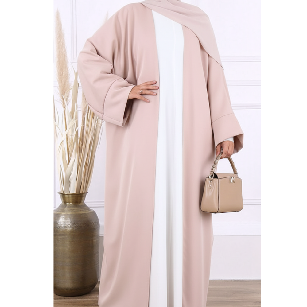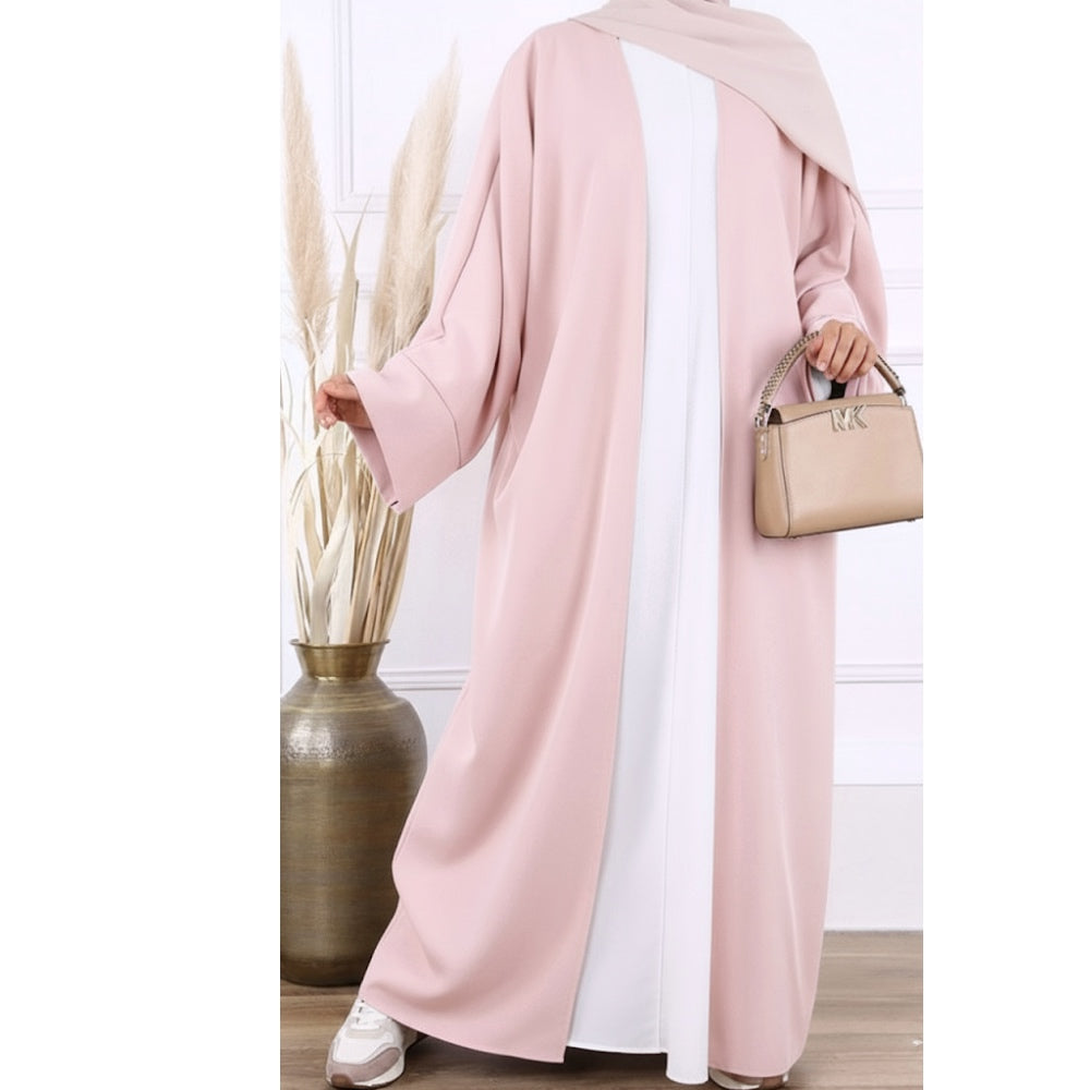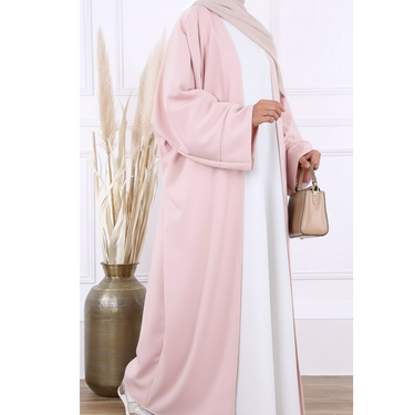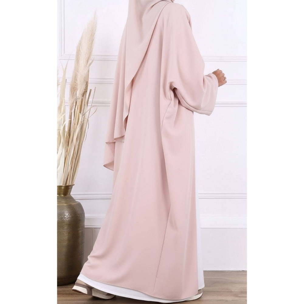 Effortlessly graceful, this soft blush abaya is the perfect blend of comfort and refined femininity. Crafted from lightweight Nidha fabric, it drapes beautifully with a flowy silhouette that flatters every movement. The self-tie belt cinches at the waist, allowing you to style it loose for a relaxed look or fitted for a more defined shape.