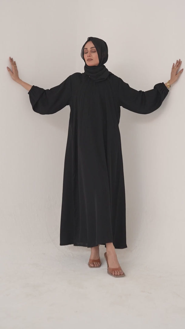 This abaya is an essential addition to your wardrobe, offering an effortlessly chic and sophisticated look. Its maxi-style silhouette is enhanced with delicate piping details along the front, adding a refined touch of elegance. Featuring loose, flowing sleeves for a graceful appearance, this abaya is paired with a pure Korean chiffon Sheila, completing the ensemble with a luxurious finish. Perfect for any occasion, this piece is one of our most sought-after designs.